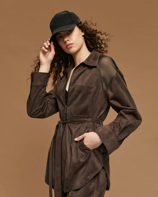 A refined suede-effect jacket accented with sheer panel details for an elevated, modern look. Designed for versatile styling, this piece brings a touch of texture and sophistication to both casual and smarter winter outfits.